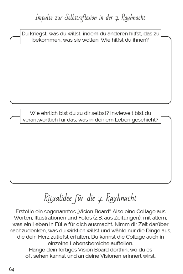Potentiell spirituellere Elemente des Journals (wie z.B. Rituale zu den Rauhnächten) sind so gestaltet, dass auch Anfänger*innen und nicht-spirituelle Menschen etwas damit anfangen können.